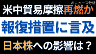 AIニュース分析 米中レアアース対立再燃:トランプ大統領の報復示唆が日本株市場に突きつける構造的課題と投資戦略 突然の「貿易上の敵対行為」宣言トランプ前大統領がトゥルースソーシャルで、中国によるレアアース関連の輸出規制拡大の動きを「貿易上の敵対行為」であると強く非難し、これに対抗するための大規模な関税引き上げを含む報復措置の可能性を示唆しました。これ... 2025.10.11 AIニュース分析