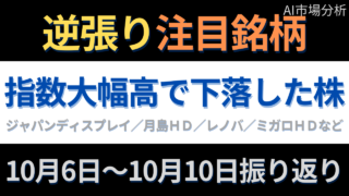 週間マーケット振り返り 【週間マーケット振り返り】日経平均急騰の陰に隠れた暴落株!【逆張り注目株】 2025年10月3日から10月10日までの1週間は、日本株市場にとって極めてダイナミックな展開となりました。日経平均株価は週間で+5.07%という大幅高を記録し、市場全体が強い上昇トレンドを享受しました。この背景には、特定の政治的イベントに... 2025.10.11 週間マーケット振り返り