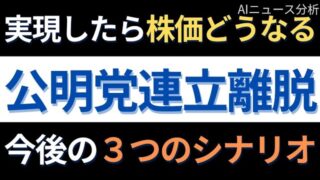 AIニュース分析 連立崩壊で激変した日本の政局 次期総理の行方と日本株市場への4つのシナリオ分析 公明党の連立離脱が発表された後の日本の政治情勢は、長年にわたり安定していた与党体制の崩壊を意味し、次期総理大臣の選出およびそれに伴う日本株市場への影響について、多岐にわたるシナリオが想定されます。公明党の連立離脱の背景、次期総理大臣の選出プ... 2025.10.11 AIニュース分析